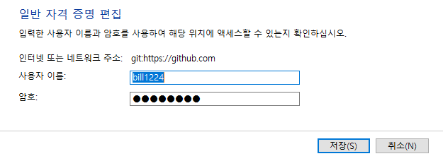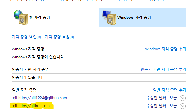 Windows 자격증명 클릭을 하면, 아래에 일반 자격 증명에 github.com 을 클릭