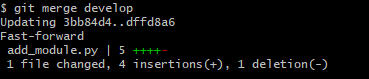 git merge 명령어를 이용해서 develop branch의 내용을 병합합니다.