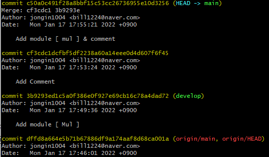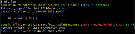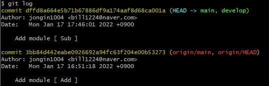 Add module [ Sub ]의 기록에 HEAD -> main, develop 으로 변경된 것을 확인 할 수 있습니다.