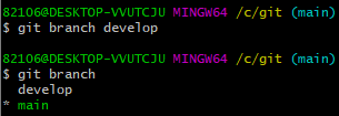 develop이라는 branch를 생성하고 목록을 확인해보면, develop branch가 추가된 것을 확인할 수 있습니다.